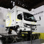 JMS展示ブースでは、2017年に日本初の量産型電気小型トラックとして三菱ふそうが発売し、2023年に車両ラインナップの拡大によって多様な輸送ニーズに対応した第三世代の「eキャンター」に「コボディ」を搭載した特別仕様モデルを展示。