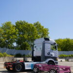 メルセデス・ベンツ・トラックスでは車両の開発段階だけでなく、モデルが量産に入った後も継続的な改善を図るため、定期的にこうした衝突試験を実施している。