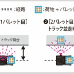 ディープラーニングを活用したパレット位置・姿勢検知のイメージ。1パレット目は、ルーフ部の3D-LiDARで、トラック荷台を検知後し荷役位置を特定し、2パレット目以降は、左右いずれかの3D-LiDARとカメラで1つ前に荷役したパレットを検知し、荷役位置を特定