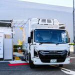 今回の配送実証はそれに続くもので、横浜市内に実証ステーションを設置し、3台のバッテリー交換式エルフEVで市内のファミリーマート約80店への商品配送を行なうというもの。主な積荷はチルド食品で、運行頻度は1台あたり1日最大3便の予定だ。
