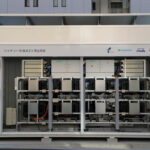 バッテリー交換は横浜市港北区の横浜アリーナ付近に設置された実証ステーションで行なう。基本構成は藤沢工場のそれと同じで、中央に車両停止位置補正装置、その左右に交換装置とバッテリーを収めた20フィートコンテナを1個ずつ並べる。交換は全自動。所要時間は4個で約7分だ。