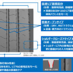 開発あたっては、同社独自のトラック・バス用タイヤ開発基盤技術「e-balance」を採用。ショルダークローズドサイプと接地端サイプの配置により、ショルダーリブ内の接地圧を均一化し、偏摩耗を抑制するとともに、路面からの入力を緩和して操縦安定性を高めた。